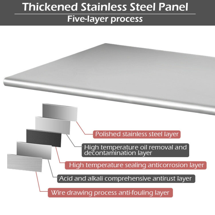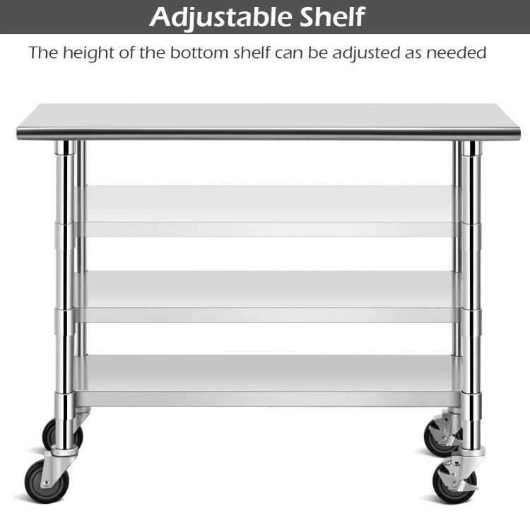 This portable table is made of durable 430 stainless steel to bear large weight and offer more stable service. The handy bottom shelf is fully adjustable to meet your needs for storing and make a good use of space. Most convenient of all, 4 universal wheels ensure you can move the work table smoothly and silently, and two of which have brakes for safe use.