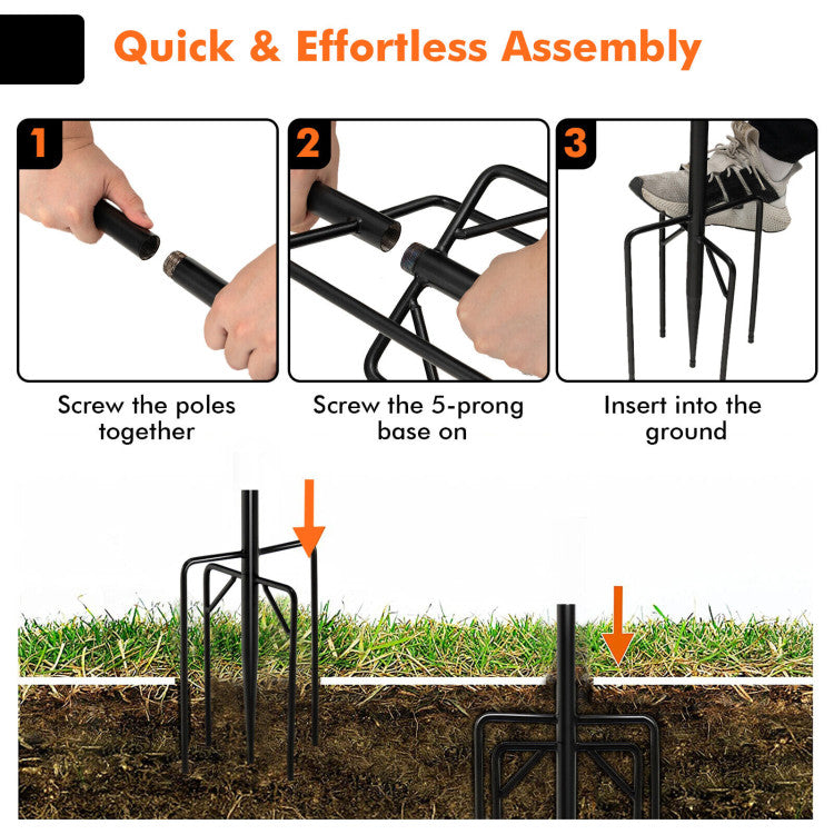 Made of solid carbon steel, the light poles are stable and durable enough for the long run. 5-prong base with solid iron bar allows you to insert the pole into the ground deeper for higher stability. What's more, the string light poles will give you better using experience. The overall height of can be changed by adding or detaching the extension poles. And they are widely applied in different places including corridor, patio, backyard, wedding, parties, etc. The 2-pack string light stands perfectly create cozy atmosphere with different ornaments hanged with. Last but not least, the poles adopt a simple screw-in connection design so that you can assemble them without tools and effort.