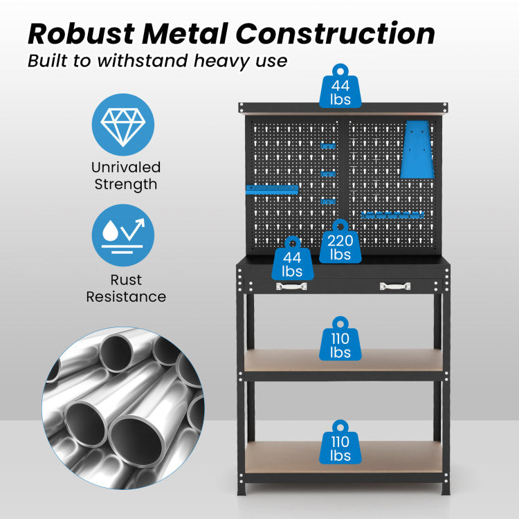 -Wide tabletop, top shelf, 2 drawers and 2 bottom shelves offer ample storage space