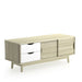Thick tabletop features superior durability and resistance, plus solid rubber legs ensure stability and great load capacity. Equipped with 2 sliding drawers and one large storage cabinet, this TV stand removes visual clutter. Besides, the rear cable management hole can tidy the messy wire. The spacious tabletop fits flat screen TVs up to 60" and can also be a display place to put paintings, vases and plants. This stylish TV storage stand can be put in the living room, bedroom, lounge, etc.