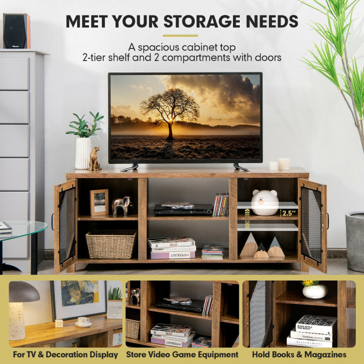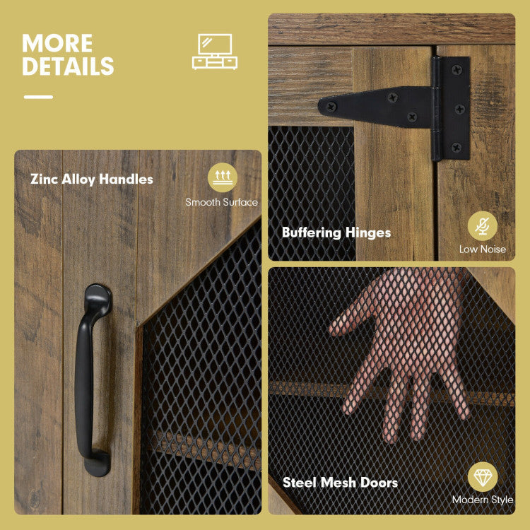 For better quality, the TV stand is made of thicken MDF and rustproof sprayed steel. Both materials positively influence the overall weight capacity (245 lbs). Besides, the entertainment center features an extra steel leg equipped with an adjustable foot pad for better stability. The console cabinet is also a great storage solution. The 58" x 15.5" countertop can hold a 65-inch TV. The 2-layer open shelf accommodates video games. Because of two 3-position adjustable shelves, the internal space of closed compartments is adjustable for more flexible storage. Finally, the TV table comes with some practical details. The steel mesh doors feature buffering hinges and zinc alloy handles for convenient pulling.