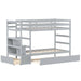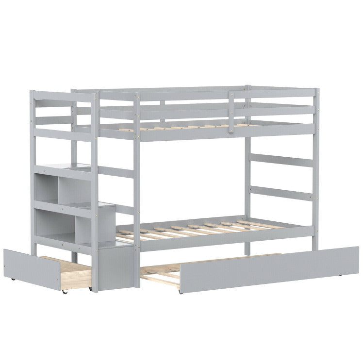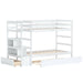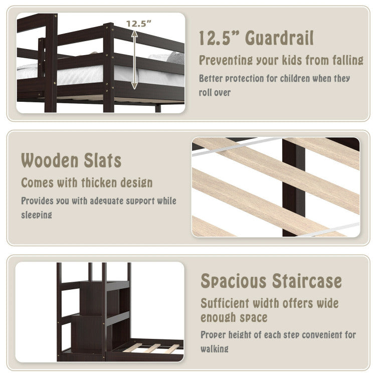 They are all made of solid wood and high-grade MDF, so the whole bed frame presents perfect sturdiness. Meanwhile, the upper twin bed comes with a 12.5" full-length guardrail to prevent kids from falling. On one side, there is a 15.5" wide 3-step staircase. Underneath, there are two open compartments for books and decorations. At bottom, the bunk bed has a rolling drawer for clothes. With these features, your kid's bedroom will become much tidier. Finally, there is no need for a box spring and the whole product will be delivered in two boxes.