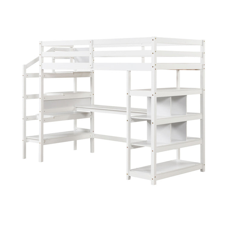 -Versatile twin loft bed with desk and bookshelves maximize space