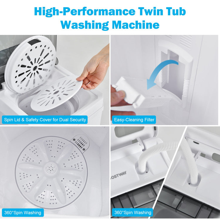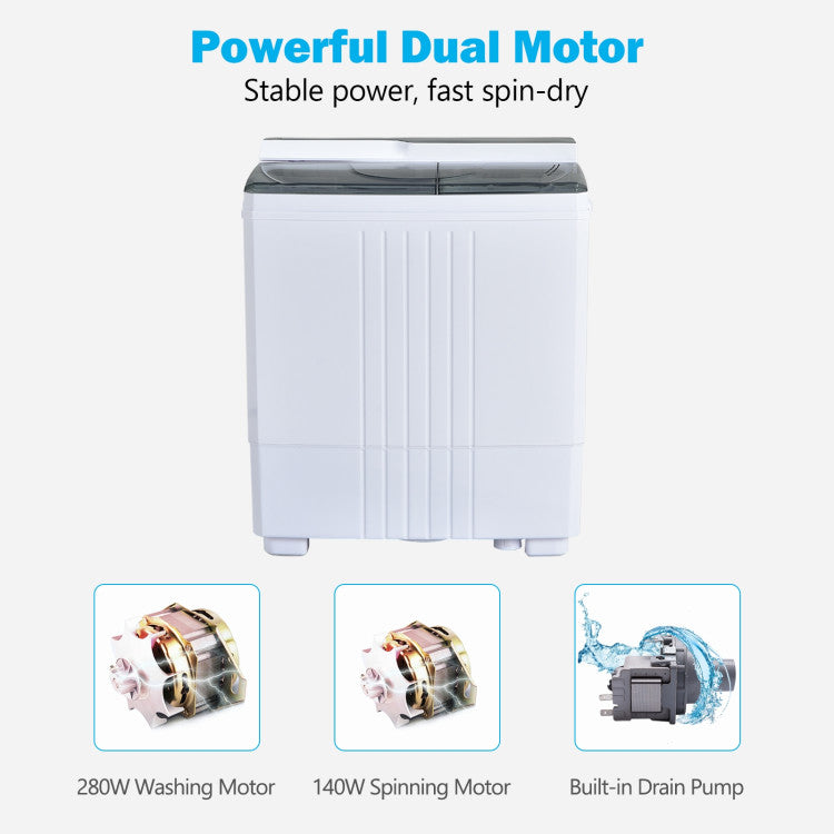 The unique double-barrel design separates the 2 processes of washing and drying. You can put your clothes in the left tub for washing, and then move them into the right tub to rinse and dry, which will save a lot of water and time, and also prevent the second pollution. What’s more, there are independent timers for washing and drying, tailoring your washing plan. Choices of 3 modes also make it more practical to meet your different needs. It will be an ideal choice to meet your daily laundry needs in your home, dormitory, apartment, or RV.