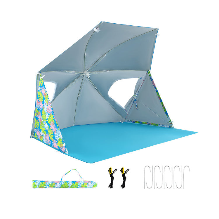 -Our 2-in-1 versatile beach umbrella tent can serve as a 7.6 x 7 ft beach sunshade umbrella or a comfy beach tent, perfect for various outdoor activities. Setting up is a breeze with its pop-up design, and it is also easy to store and transport with an included carrying bag. More than that, crafted of premium polyester fabric with silver coating, the tent cold blocks up to 98% of the sun's harmful sunlight, ensuring your skin stays safe from sun damage. You can also enjoy optimizing air circulation and beautiful scenery by opening 2 zippered mesh screen windows. The tent can be firmly secured by 9 metal stakes and 2 wind ropes, ensuring excellent stability.