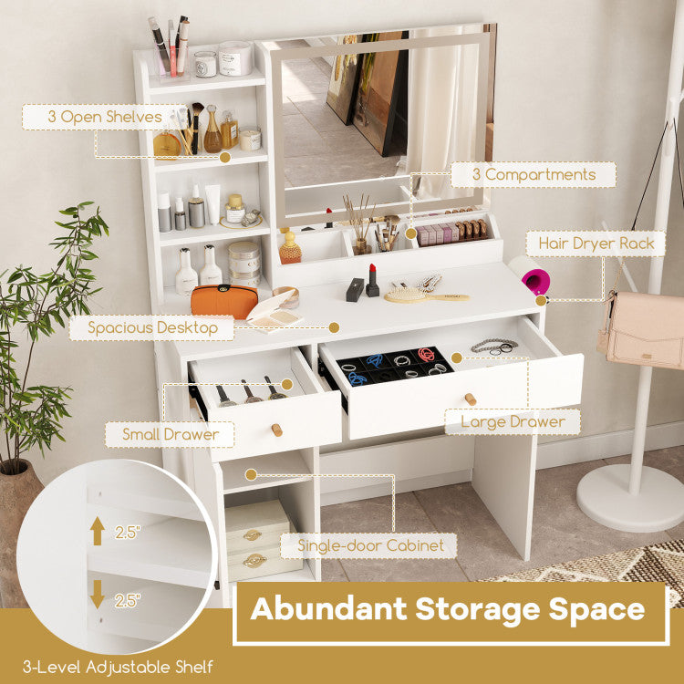 -3 open shelves, 3 compartments, 1 small drawer, 1 larger drawer, and 1 single-door cabinet for ample storage space