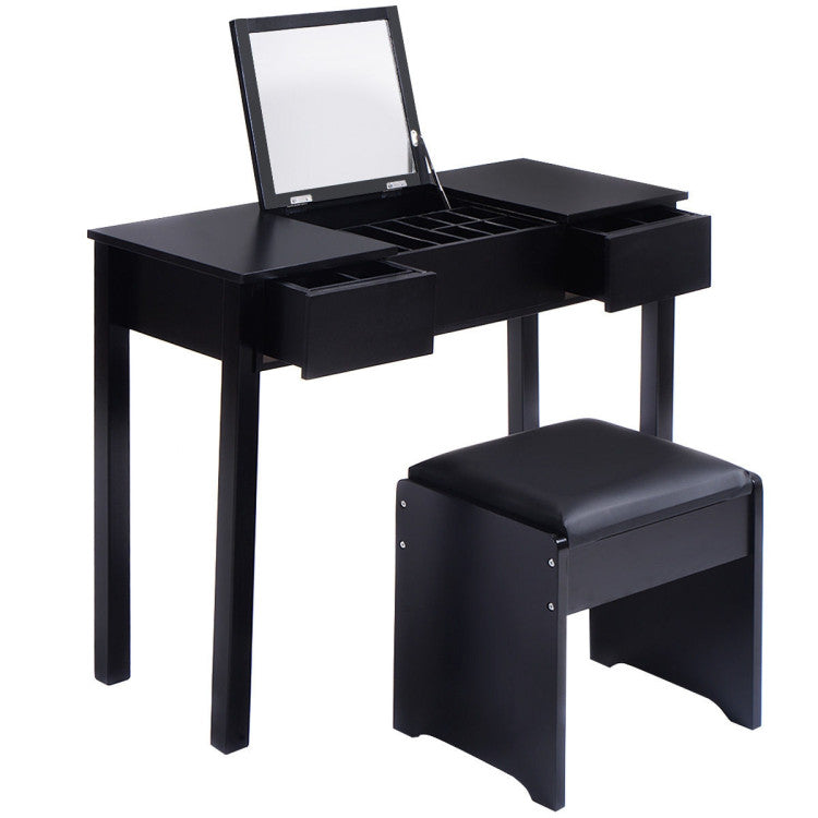 Made of thick solid MDF, this vanity table set is sturdy and durable enough to serve you a long time. Lift up the middle of the table top to reveal a mirror and you can also find there are many hidden storage boxes for your jewelry and ornaments. The dressing table also has 2 drawers on each side providing plenty of storage space. The spacious tabletop is large enough for you to display and organize your all kinds of cosmetic and makeup tools. The big mirror easily reflects images clearly. The table comes with a cushioned stool, so you can sit comfortably when doing makeup.