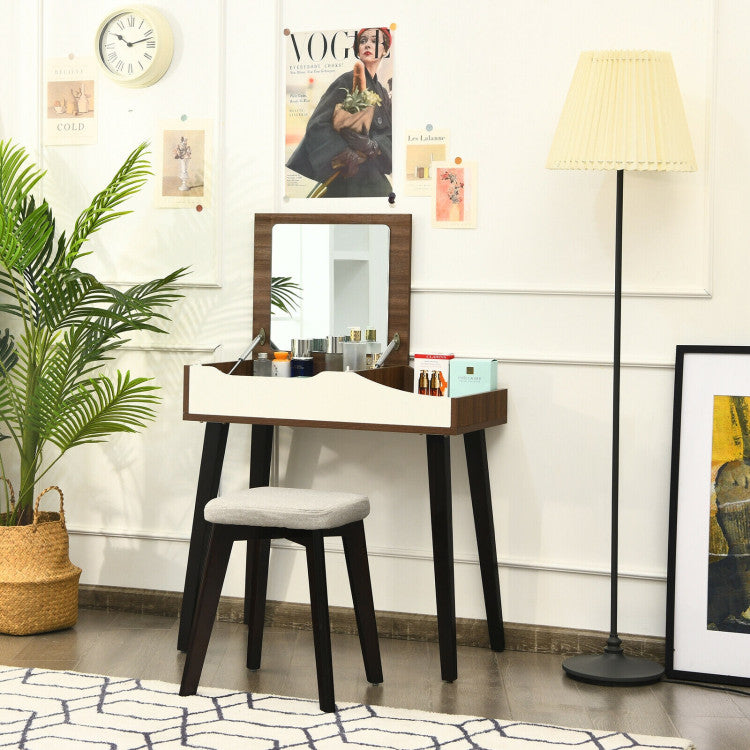 This dressing table is equipped with a flip top mirror. The pneumatic lift system and the buffer design are really helpful to protect the hinges and the wood boards. What’s more, solid wood legs and anti-skid pads make it more stable for long-lasting service.