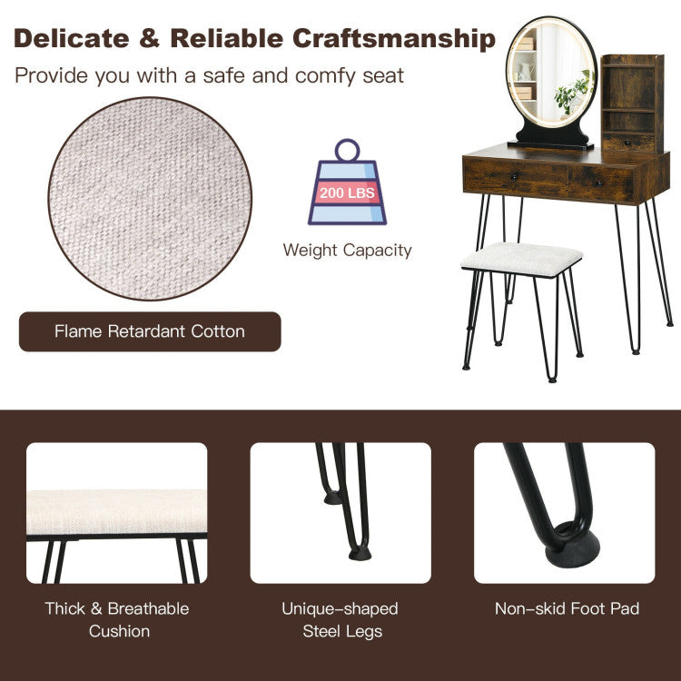 With three colors and adjustable brightness, you will feel comfortable and convenient to dress yourself under any conditions. Gently touching the surface of table, you will be amazed at its smoothness which also offers convenience for cleaning. Legs are all designed in an elegant way while retaining its solidness to provide strong support. A large tabletop, an exquisite table shelf and two drawers, one of which has divider, provide you with more options and make jewelry organization easy and simple. If you are looking for such a wonderful vanity set, please don't miss it and bring it home right away!