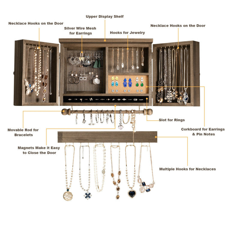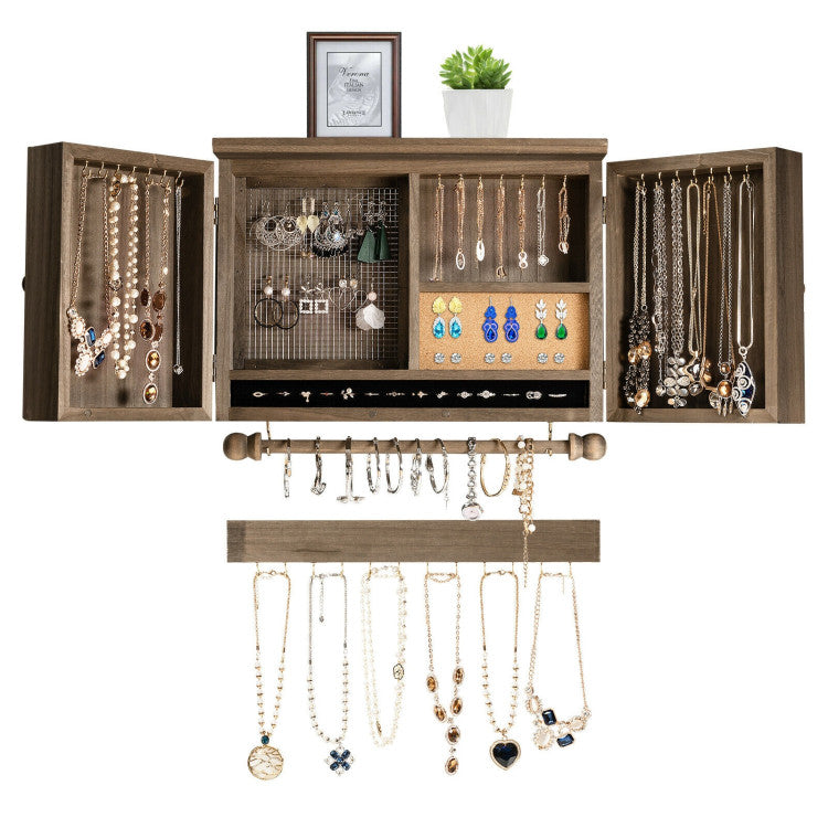 You will no longer get frustrated searching for earrings, necklaces, bracelets, rings or other jewelry. You can get what you want right when you open the doors of this jewelry organizer. Since there are multiple metal hooks, large silver metal mesh, padded slot and removable rod, all designed to keep your jewelry organized. Its humanized wall-mounted design also allows you to mount it at any height you want. No need to assemble as it is already assembled. The organizer is also capable of serving you for a longer time thanks to the durable paulownia wood. It is sturdy enough as well, which can be seen at its reinforced metal hinge.