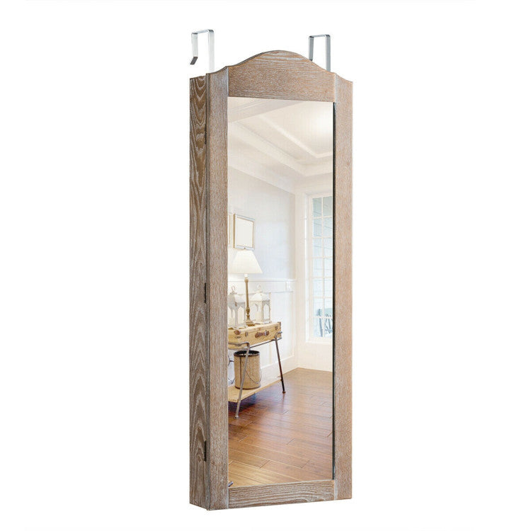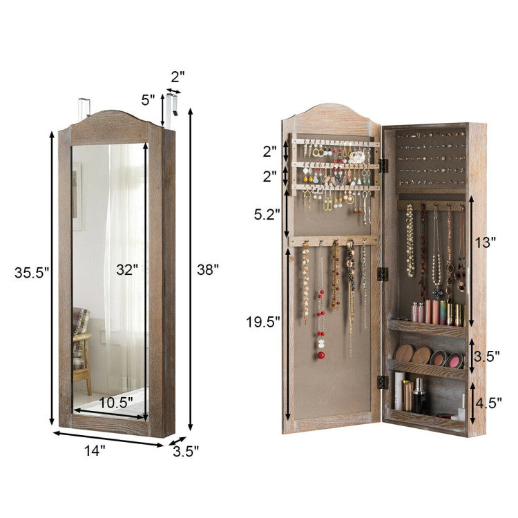 It is specially designed for all your valuables, and keeps your jewelry organized , then prevents them from getting tangled. So once you open the cabinet, your jewelry is clear at a glance. The cabinet comes complete with space for 3 lined shelves for holding earring, 10 hooks for hanging necklaces and bracelets, 5 rows ring slots(60 ring slots) for placing ring and 3 storage shelves for other items and a full length glass. In addition, you can screw it on the wall or attach the hooks hang over the door, just do it as you like. This practical and rustic jewelry armoire cabinet is an attractive artwork.