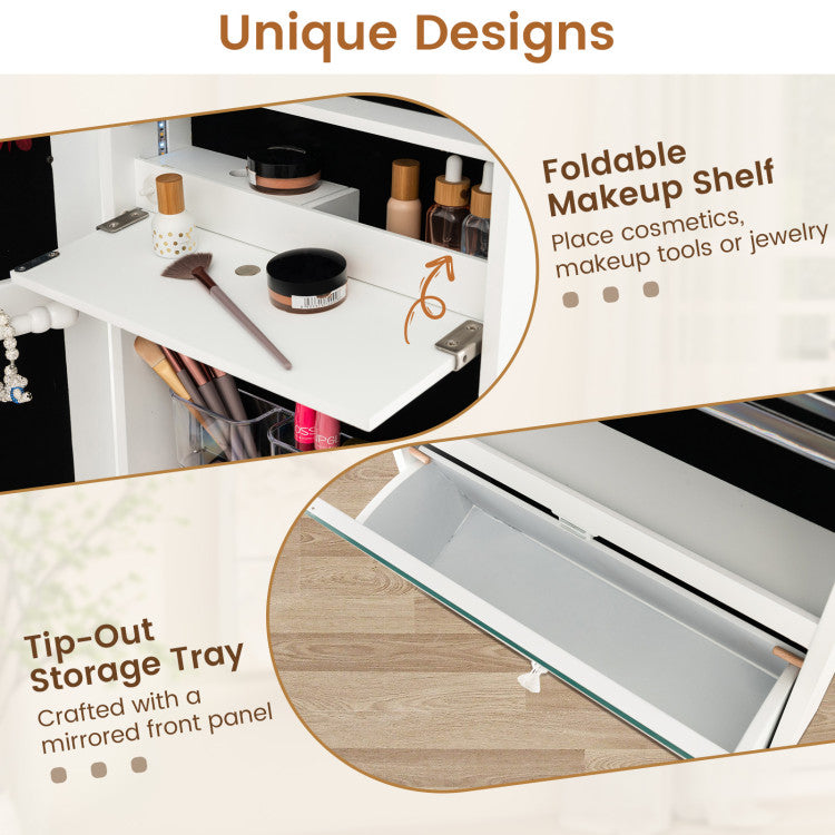 -Unique designs of a foldable makeup shelf and tip-out storage tray