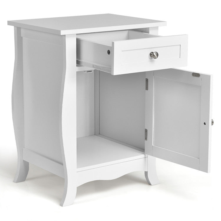 This side table is a perfect combination of practical storage and home decoration. Featuring a spacious table top, drawer and single-door cabinet, this end table can provide large storage space for daily essentials, making ythe room tidy and neat. The exquisite white finish and unique wave-shaped bottom make the table an elegant and stylish addition to ythe home. As for the quality, this floor cabinet is made of premium MDF with NC paint, ensuring great sturdiness, water resistance and durability. Smooth ball bearing slides and round metal handles are designed for convenient use. Overall, this practical and good-looking end table is multi-functional that can be placed in the bedroom, living room, entryway or anywhere you need.