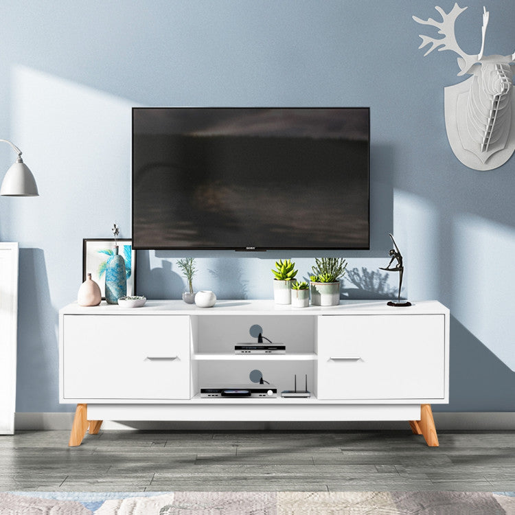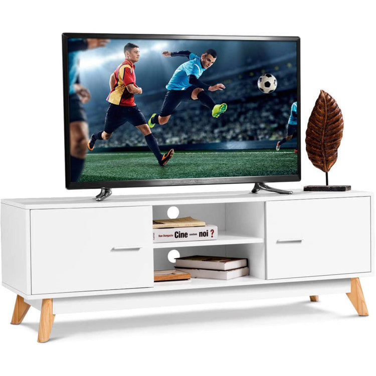 It resembles a mid-century furniture with its tapered, angled wooden legs which creates a vintage inspired overall composition mixed with modernism. Highly adaptable for many uses, you can update your decor by placing this striking white stand in your bedroom, living, or family room area. Featuring an open shelf and two hidden cupboards are perfect for any media components with a cord management opening at the back. This clean, white stand is efficient in design and will definitely add the extra touch to your environment. Made of high quality MDF, it ensures durability and resistance against wear and tear over time.