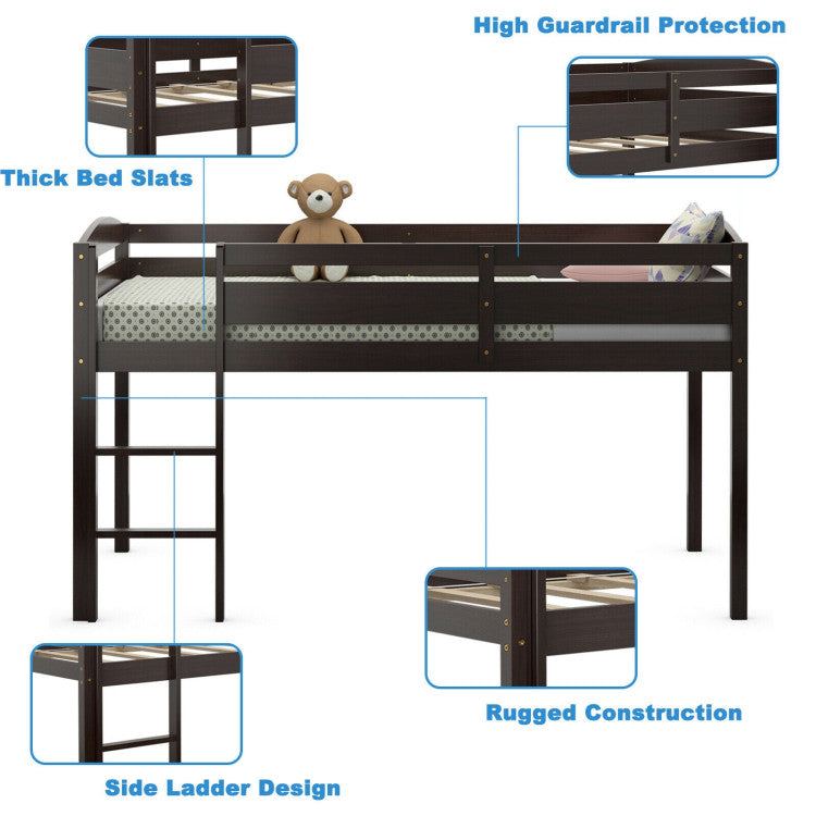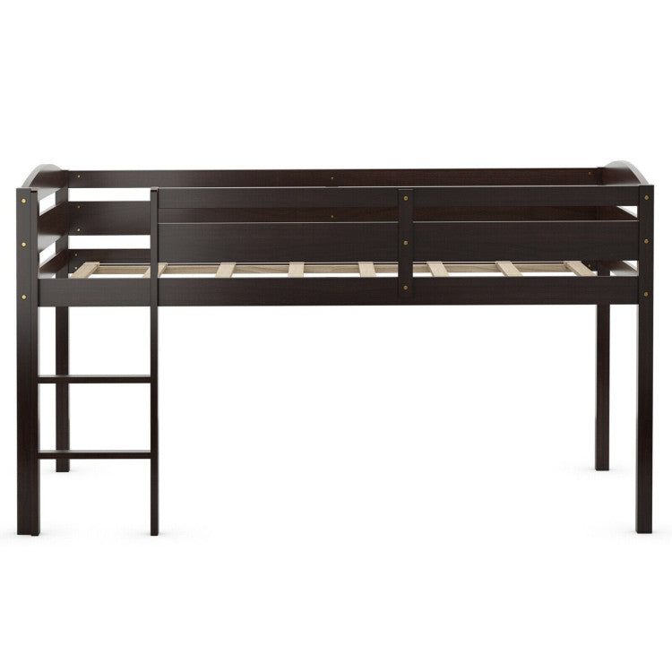 High-quality solid wood and sturdy PB ensure the durability and solidity of bed. 4 wooden legs and thick slats make the bed can hold up to 353 lbs; both kids and adults can use it. There is a floor space under the bed, which can be used as storing toys or building a fort. Not only that, we have a lot of humanized designs to ensure the safety of users as much as possible. 15.5 inch high guardrails protect kids from falling from the bed; low height bed is safer than other loft beds. Our loft bed comes with a classic color that can match well with your home.