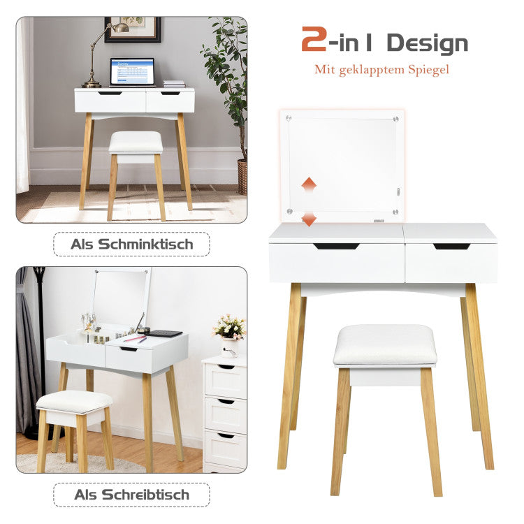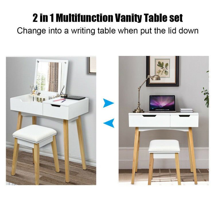 It is made of high quality density board and wood, which is durable and has a long service life. The soft and sturdy stool makes you feel more comfortable and safe when sitting on it. This dressing table set includes a drawer and an oversized storage space that provides plenty of storage for your makeup, glasses, or other accessories. This functional flip mirror design give you the best view of your makeup. Above all things, it is not only a vanity dressing table, but also serve as a writing table when the top mirror is flip closed.