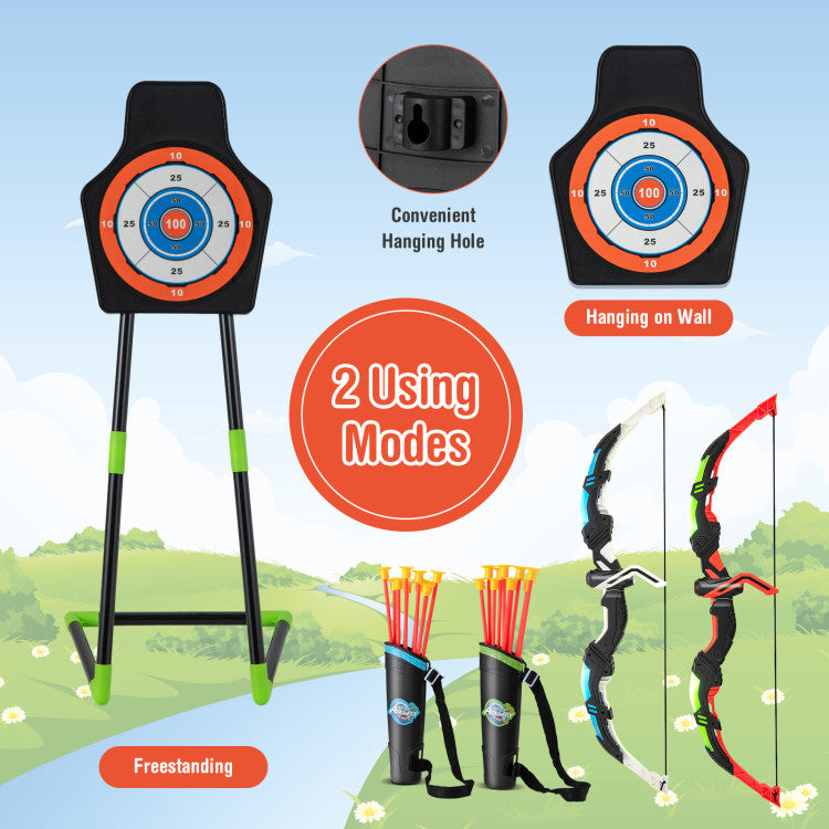 -Package Includes 20 Arrows, 1 Target, 2 Quivers, 2 Bows, 1 User Guide, 1 Gift Box and 2 Target Stickers